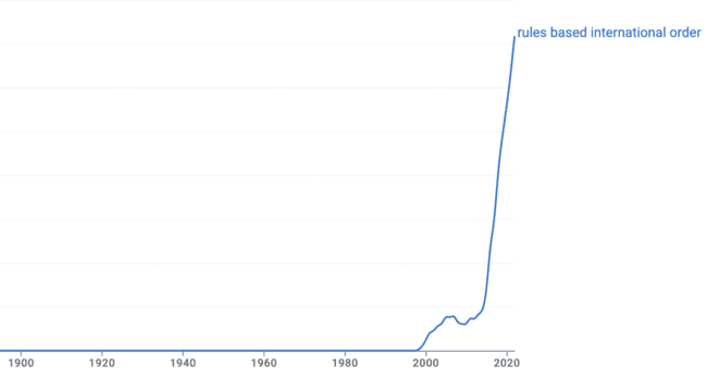 But nobody in that period ever talked about a rules-based international order. This graph from Google Ngram shows how often the phrase is mentioned in books published in each year. It’s a flat line for most of the 20th century, before surfacing in the late 1990s and spiking in the late 2010s.